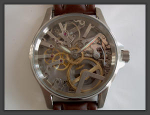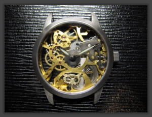 Zu meiner Arbeit gehören auch Anfertigungen.Beispielsweise fertige ich mechanische Skelettuhren nach Kundenwunsch an. Es können beinahe alle Sonderwünsche erfüllt werden: Vergoldet, versilbert, mehrfarbige Ausführung, Teilskelettierung, eingearbeitete Initialen oder Symbole, etc.Hier einige Beispiele von Skelettuhren, die ich bereits für Kunden angefertigt habe: