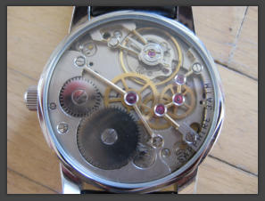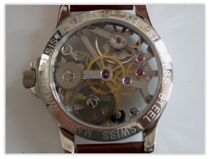 Die folgende Uhr war ein ganz besonderer Auftrag:Sie sollte rückwärts laufen und an einem Tag nur 10 Zeiteinheiten anzeigen.Es war zwar etwas knifflig, aber letztendlich kann der Kunde seine Uhr nun tragen!