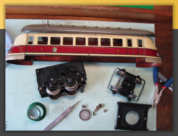 mit der Reparatur historischer Blecheisenbahnen (Tinplate)